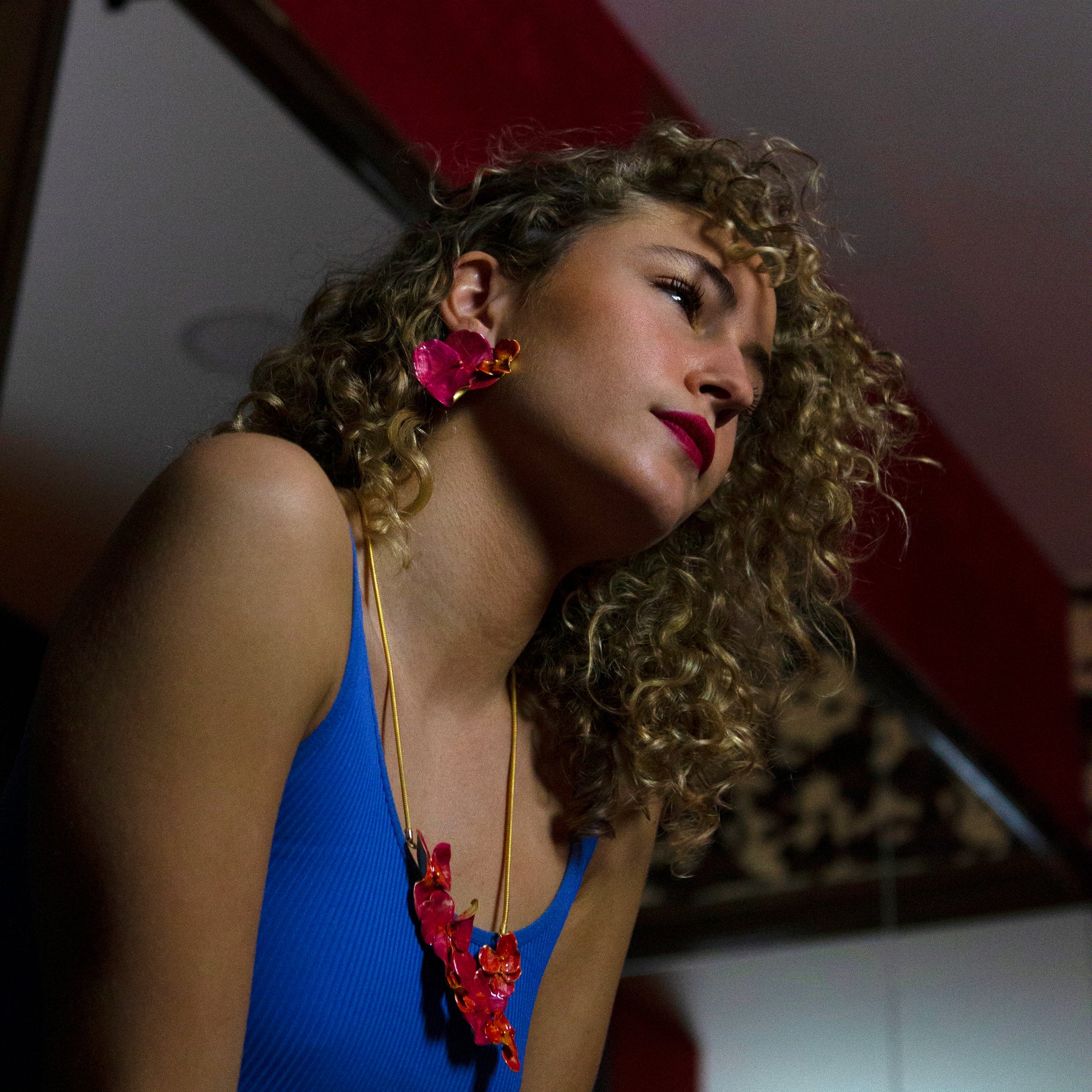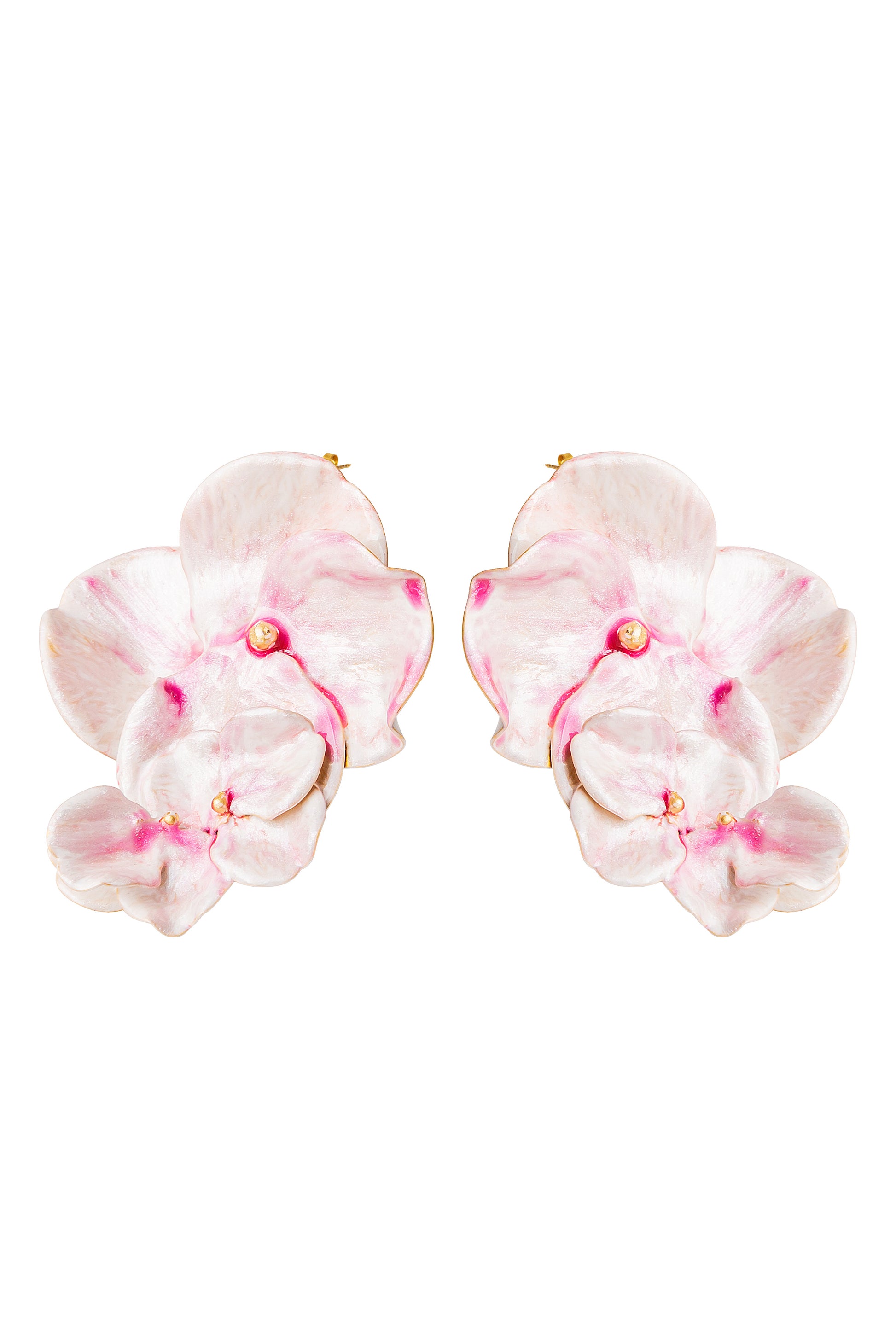 Pendientes flores grande. Dorado mate o Esmaltadas en nácar/malva o fucsia/naranja.