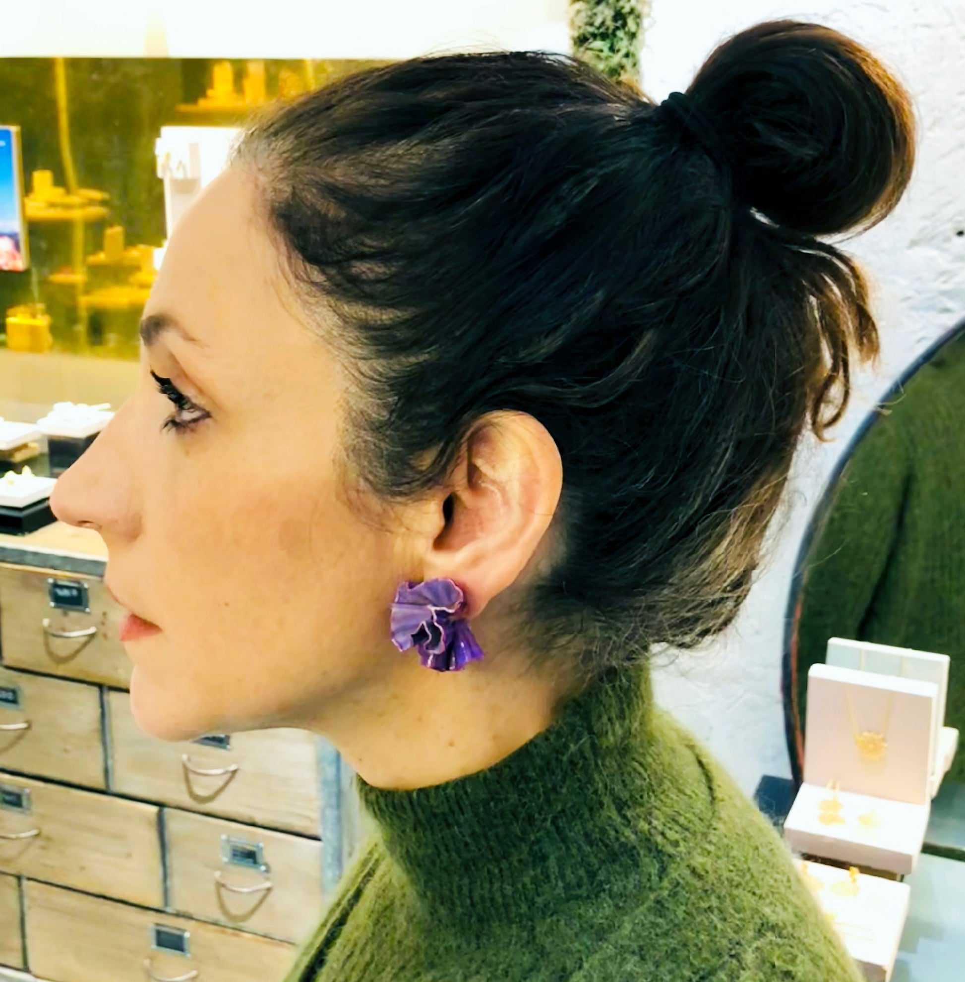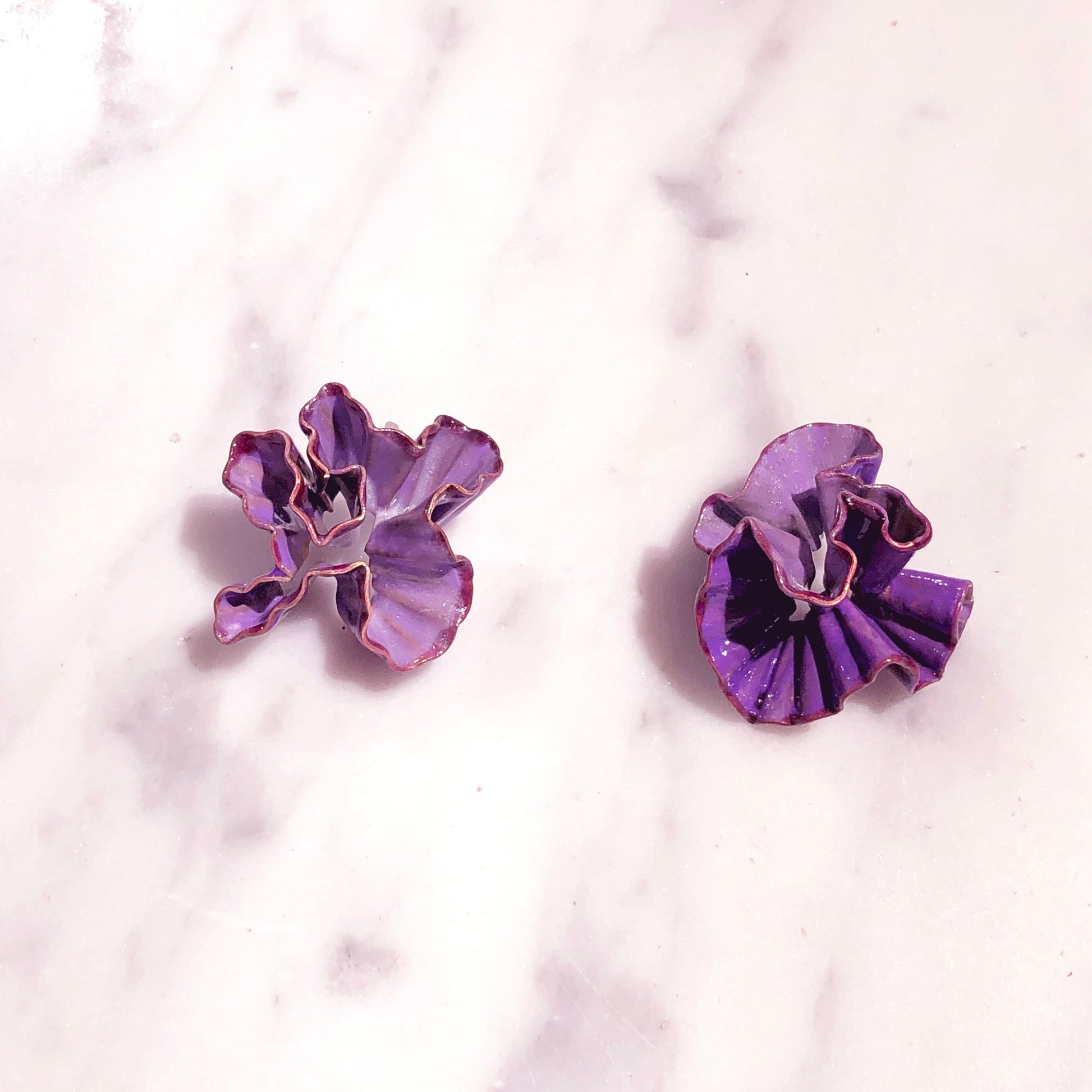 Pendientes realizados en latón con perno de plata y presión baño de oro de 18Ct, esmaltados en lila.